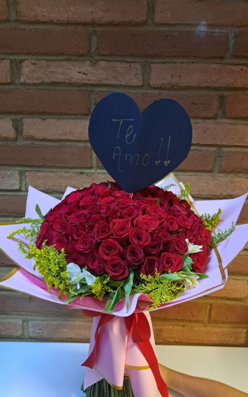 <p>RAMO CON 100 ROSAS ROJAS ARREGLADO CON SOLIDAGO Y ASTROMELIAS, ENVUELTO EN PAPEL TONOS DISPONIBLES.</p>
