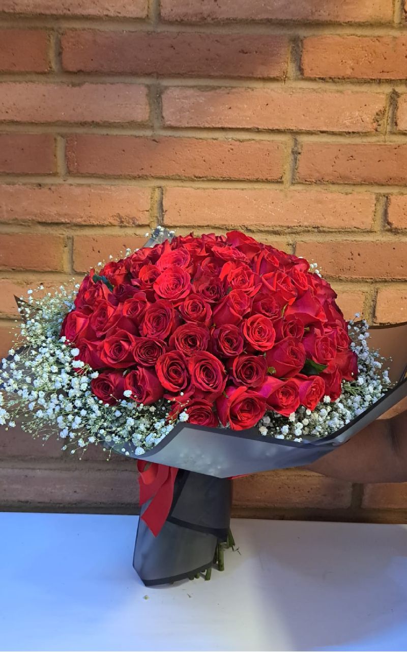 <p>RAMO CON CIEN ROSAS ROJAS Y NUBECITA, ENVUELTO EN PAPEL COREANO EN TONOS DISPONIBLES-</p>