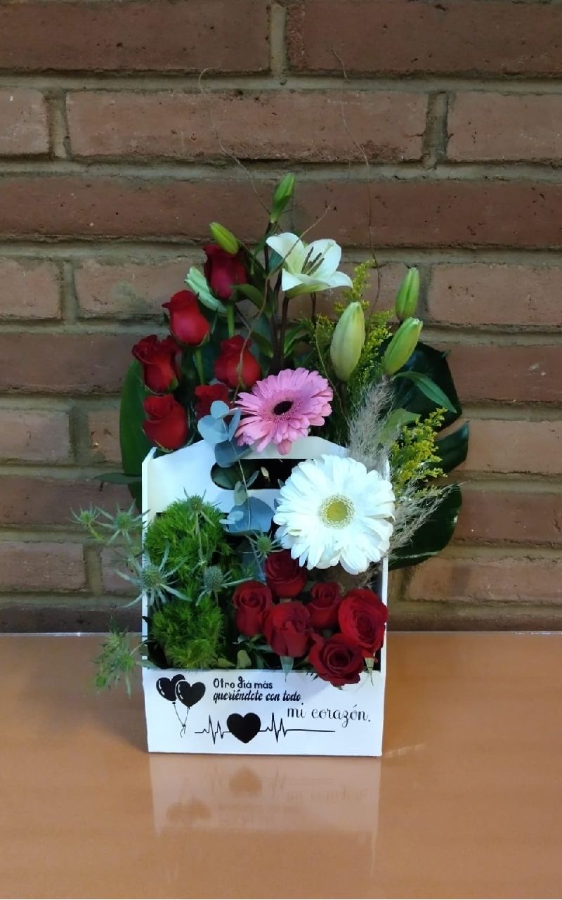 CAJA CON 12 ROSAS GERBERAS Y LILIS
