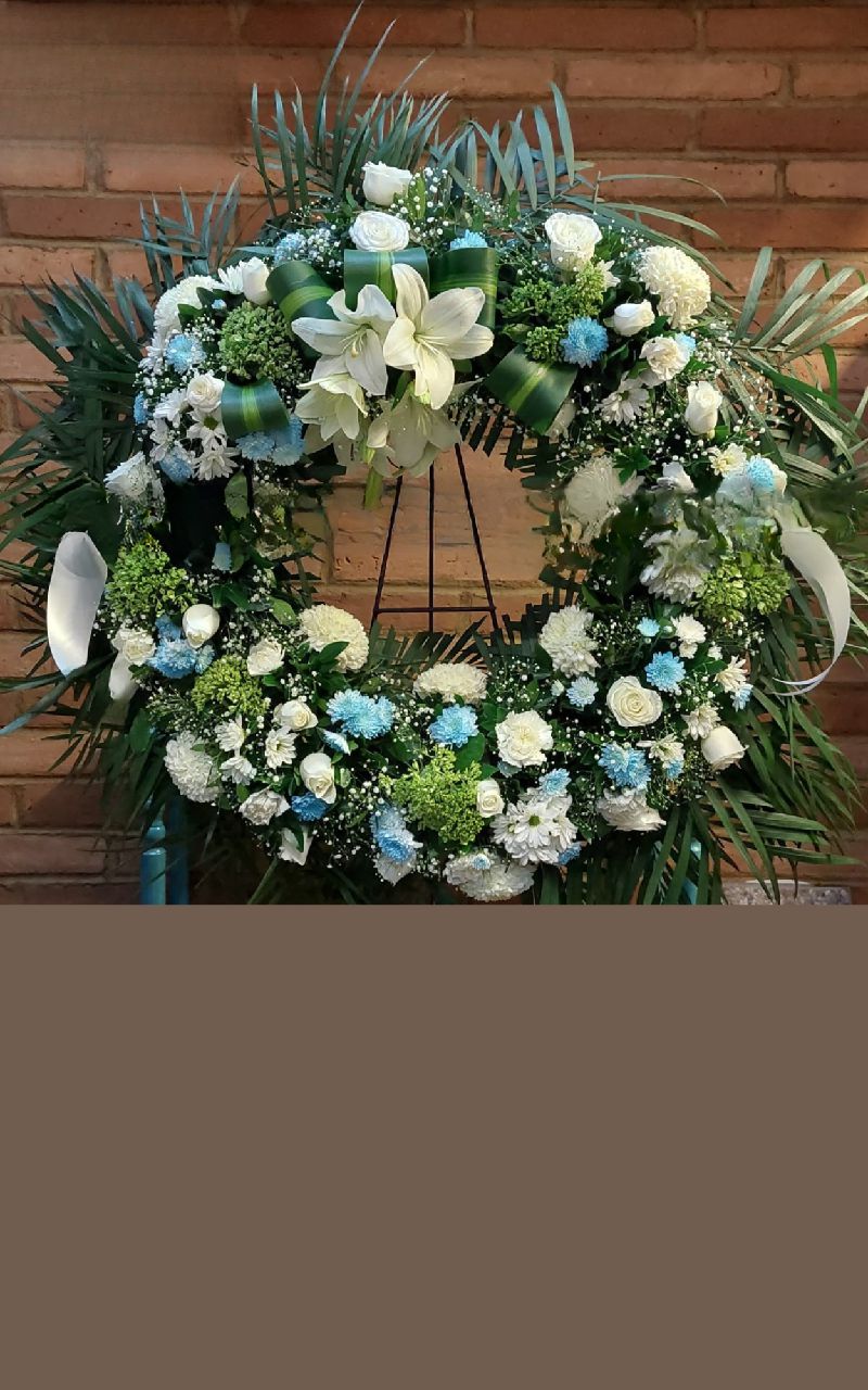 CORONA CON ROSAS Y MARGARITAS AZULES