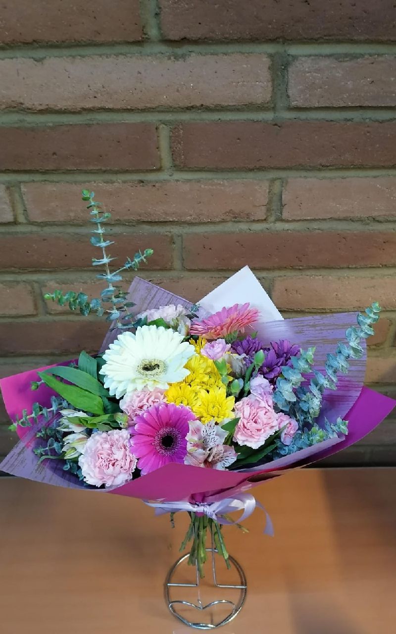 <p>RAMO CON 3 GERBERAS, 4 CLAVELES, MARGARITAS Y FOLLAJE, ENVUELTO EN PAPEL COREANO EN TONOS DSIPONIBLES-</p>