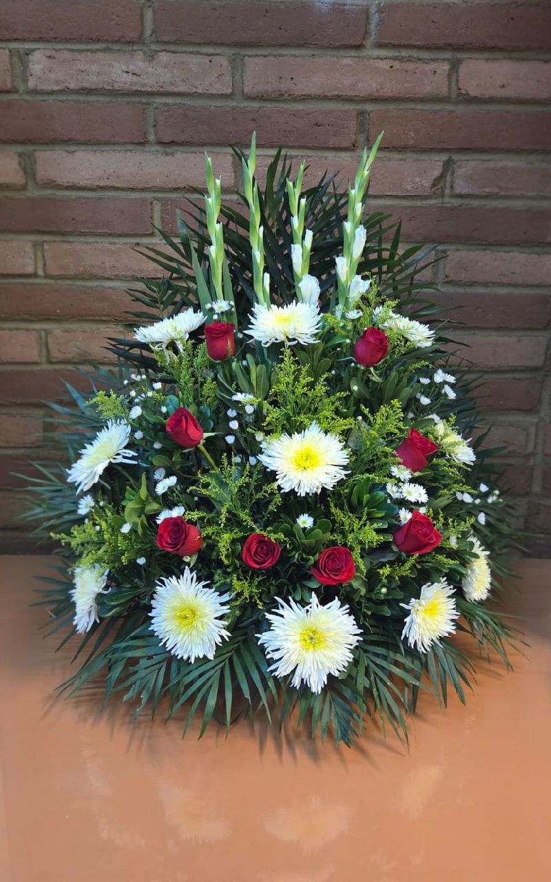 <p>ARREGLO FUNEBRE DE 8 ROSAS ROJAS, 4 GLADIOLAS BLANCAS Y 11 POLAR</p>