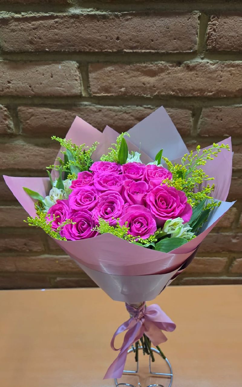 <p>RAMO 12 ROSAS ROSAS ARREGLADO ENVUELTO EN PAPEL COREANO</p>