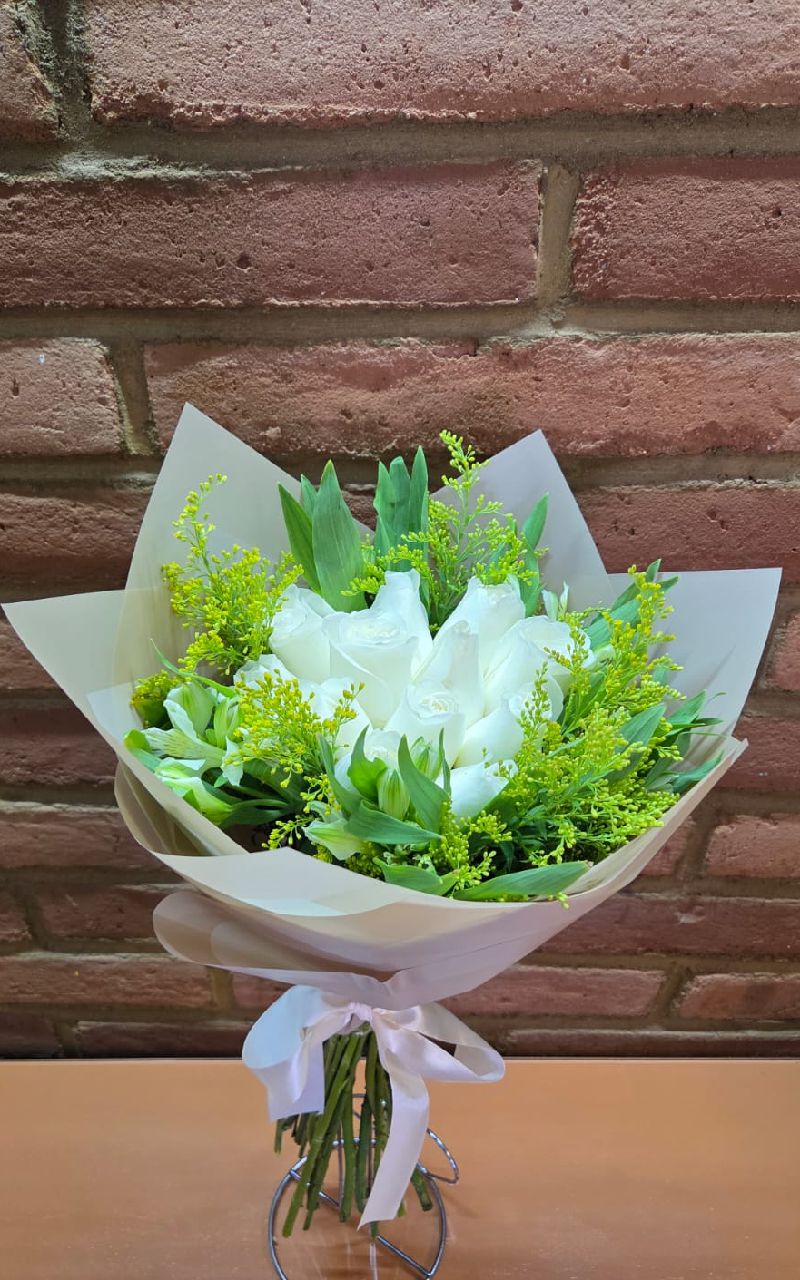 <p>RAMO 12 ROSAS BLANCAS ARREGLADO ENVUELTO EN PAPEL COREANO</p>