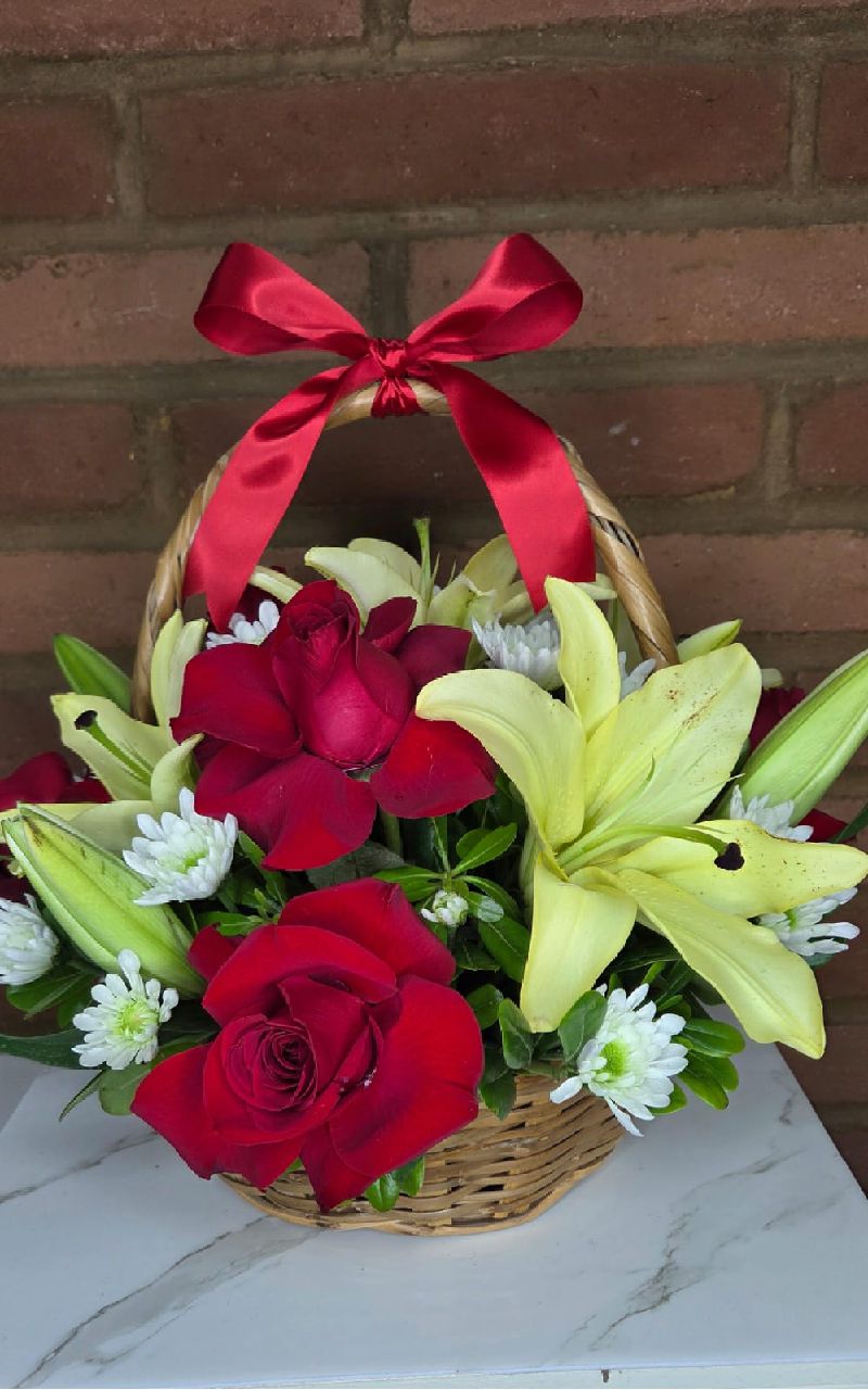 CANASTA DE ORIENTAL Y 6 ROSAS