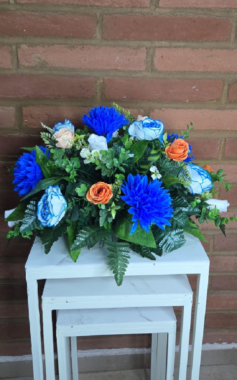CUBRE CAJA ARTIFICIAL DE FLORES AZULES Y NARANJAS