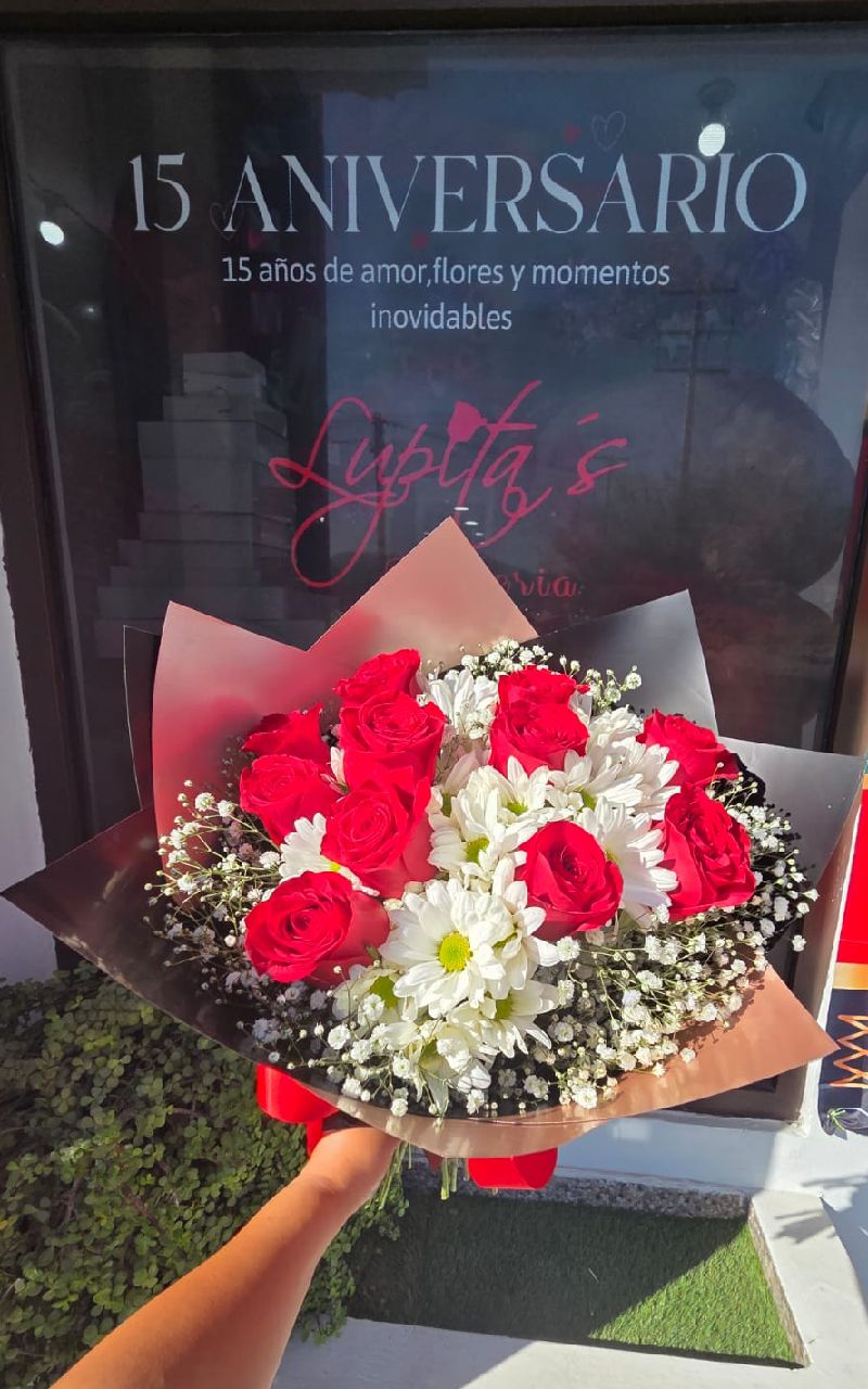 BOUQUET 12 ROSAS CON MARGARITA Y NUBE